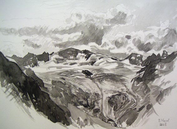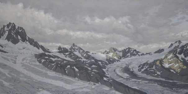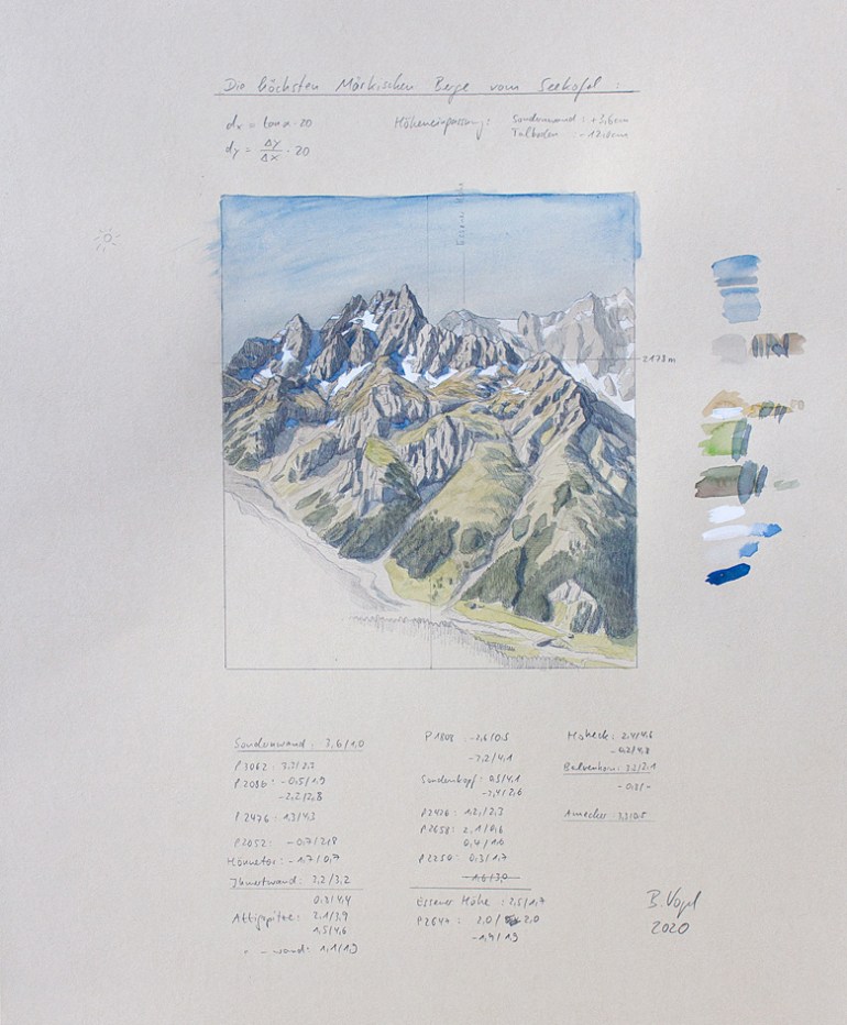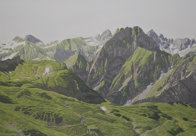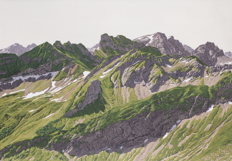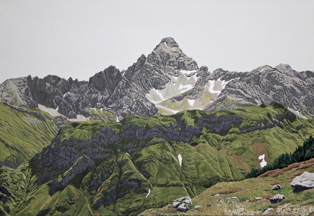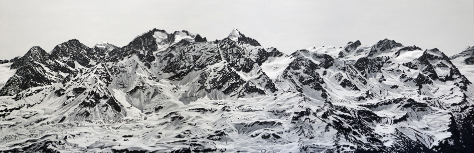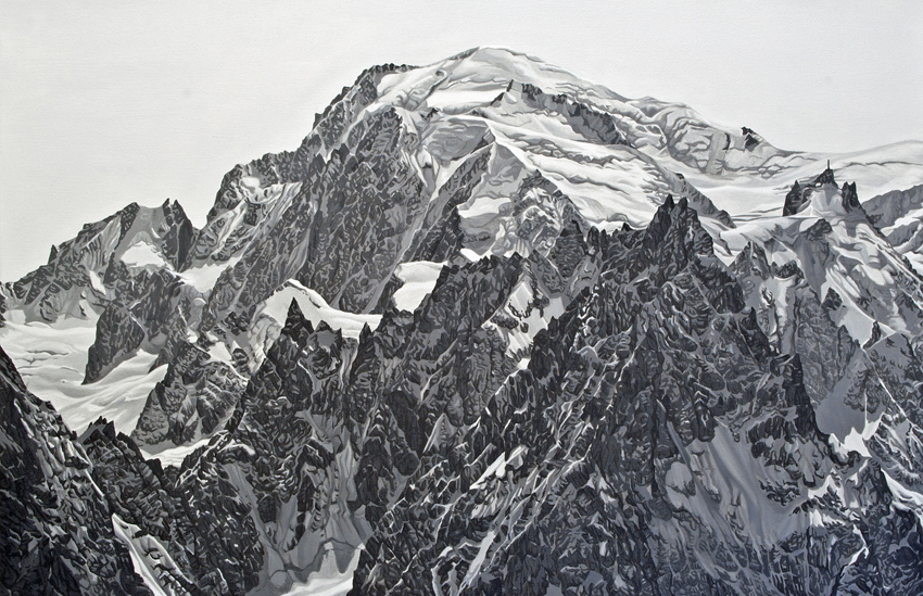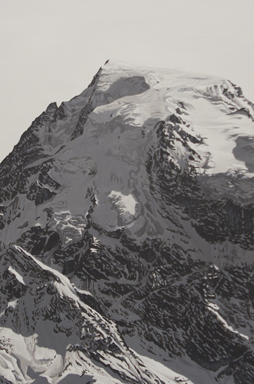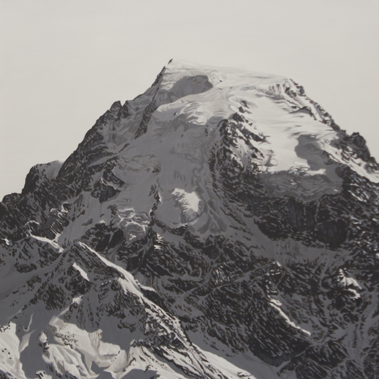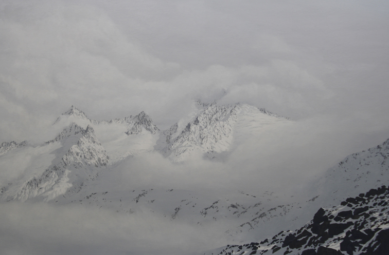 Um erfundene Berge glaubwürdig darstellen zu können, ist es unumgänglich sich mit echten Bergen auseinanderzusetzen. Inspiriert von den reduzierten Fotografien Peter Mathis, Michael Schnabels oder Michael Reischs ist in lockerer Folge eine Serie farblich reduzierter und auf das Relief fokussierter Bilder entstanden. Eine Serie, die sicherlich noch wachsen wird…