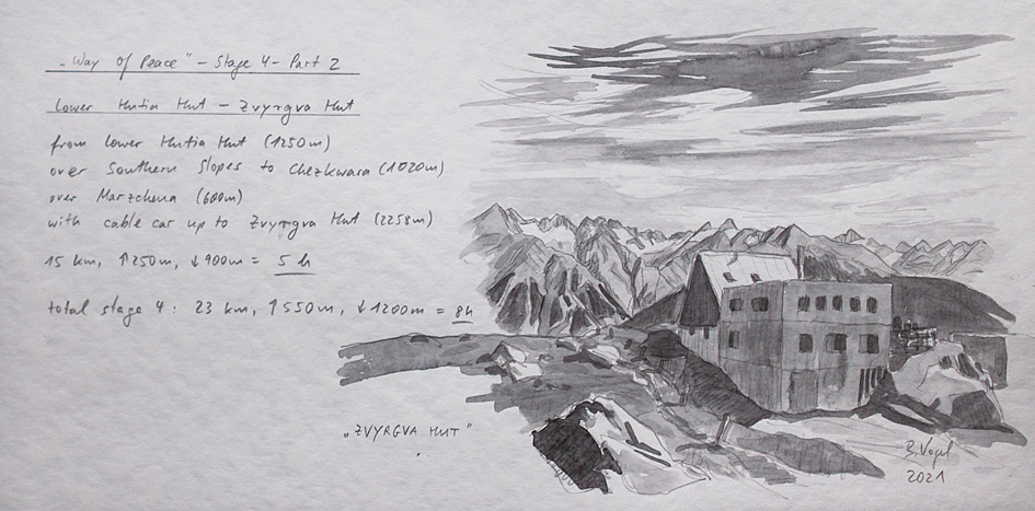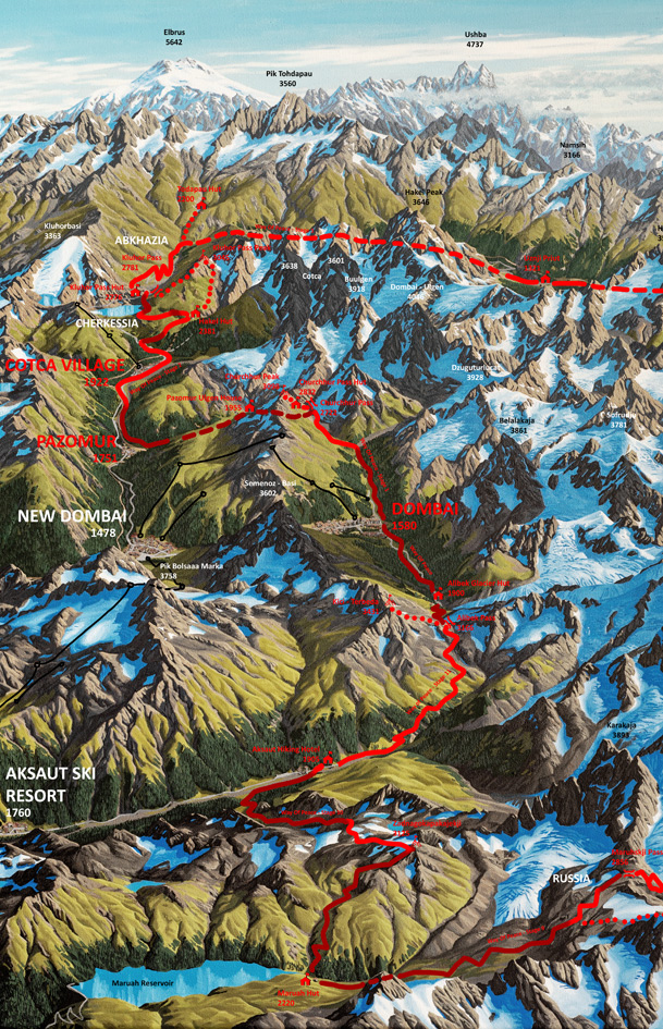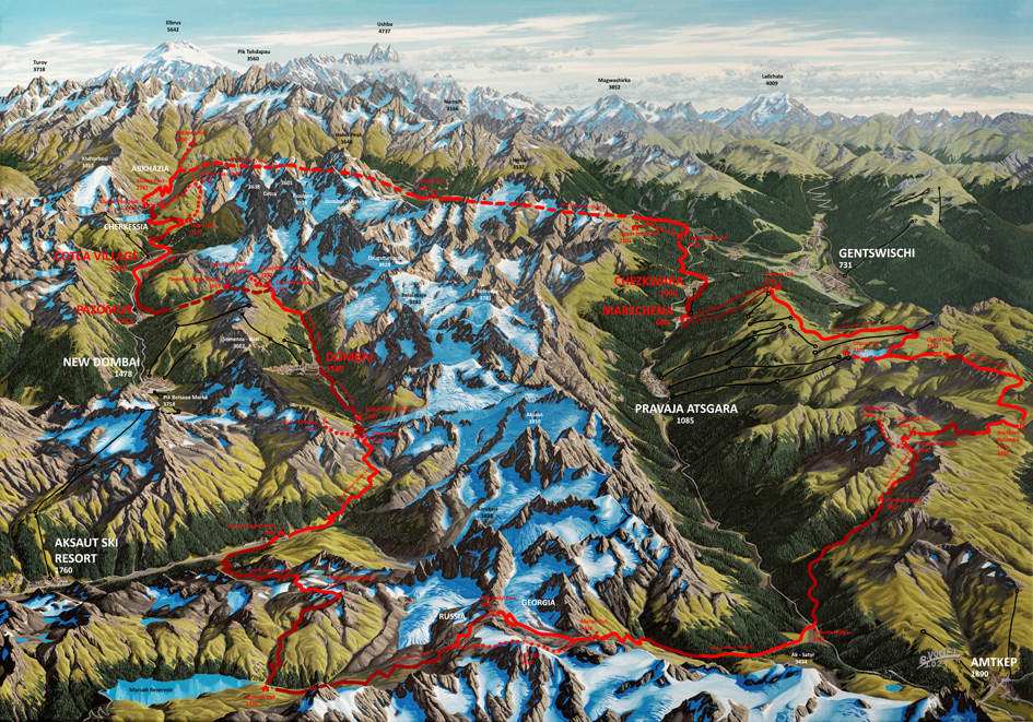 Diese fiktive Landschafts-erschließung ist meine erste politisch motivierte Werkreihe. Ich habe eine Bergregion im Kaukasus touristisch erschlossen um die Utopie eines friedlichen Zusammenlebens zwischen Tscherkessen und Abchasen zu entwerfen. Diese wird durch den „Way Of Peace“, einen länderübergreifenden Hüttentrek als symbolisches Highlight, gekrönt. Eine Tour, auf der ich gerne einmal wandern würde…