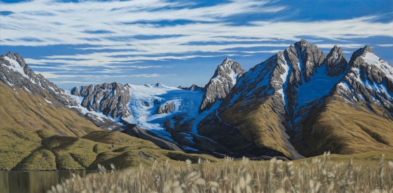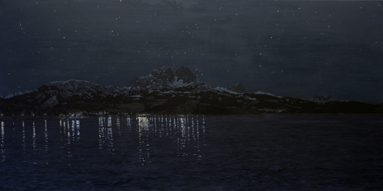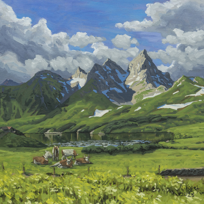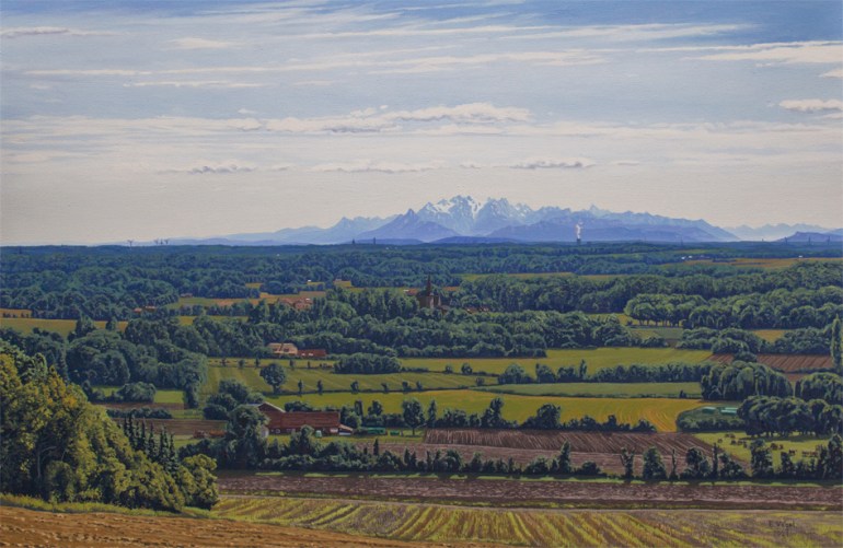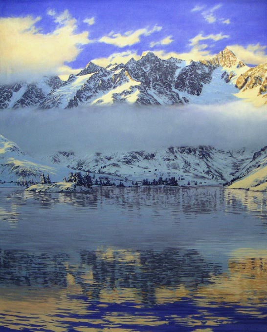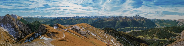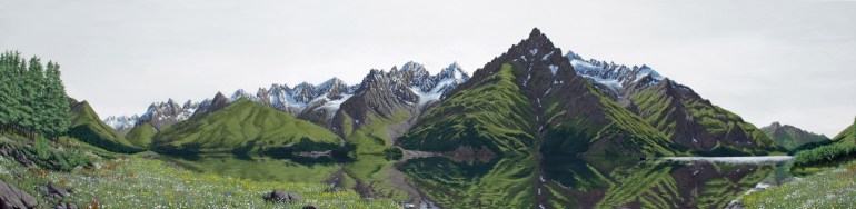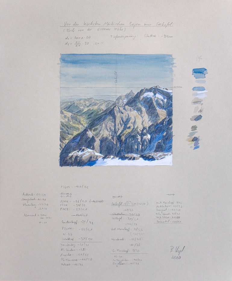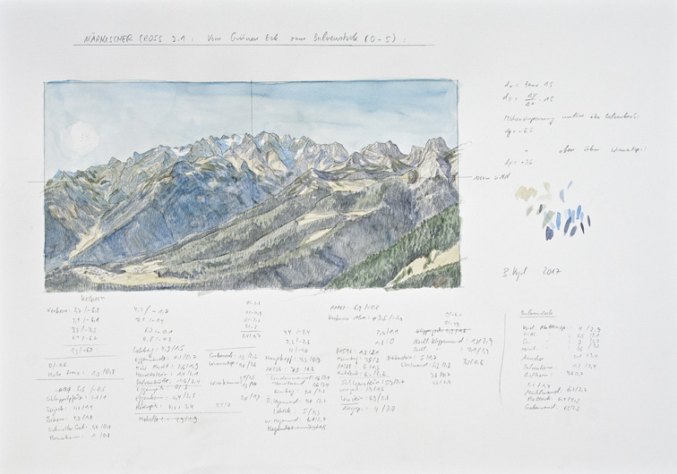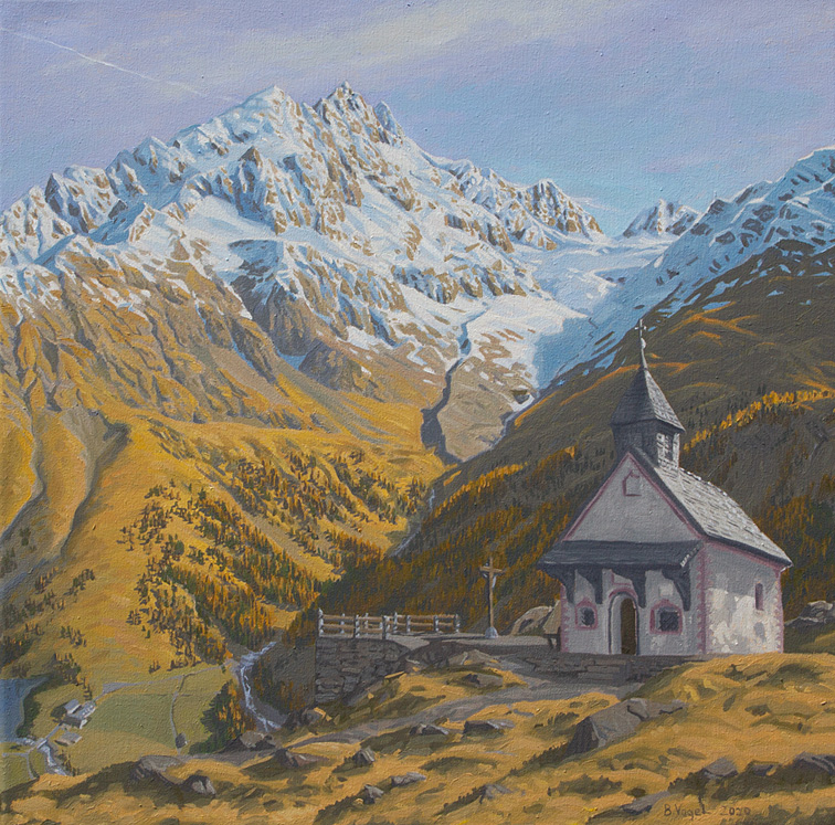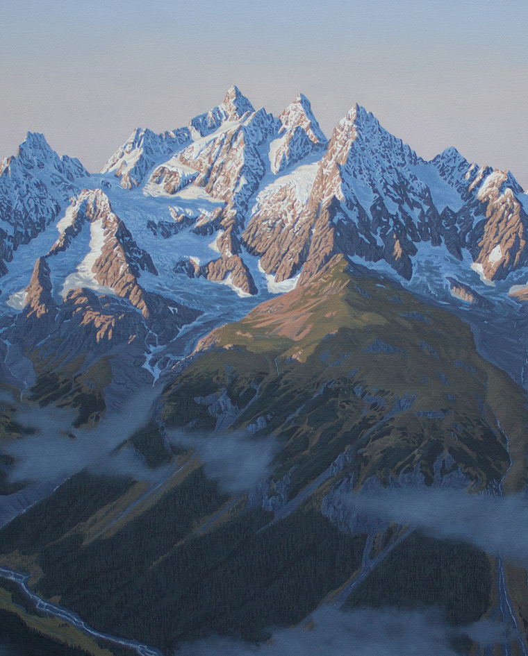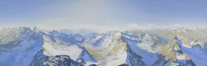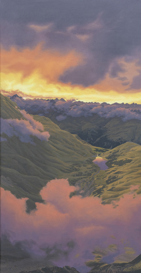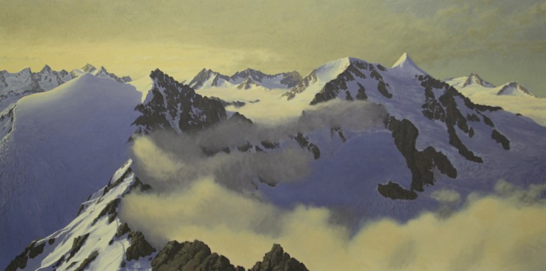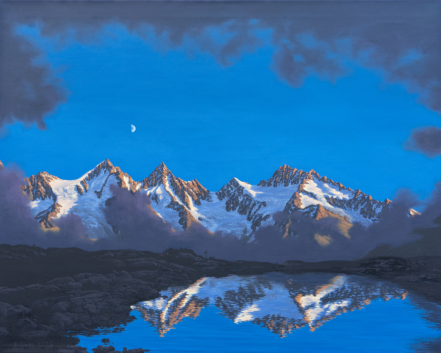 Hier setzte ich realen Berglandschaften in den Alpen, zu denen ich einen intensiven Bezug habe, meinen fiktiven Stempel in Form einer überragenden Berggestalt auf, vertiefe und verbildliche dadurch meine Liebe zu ihnen.